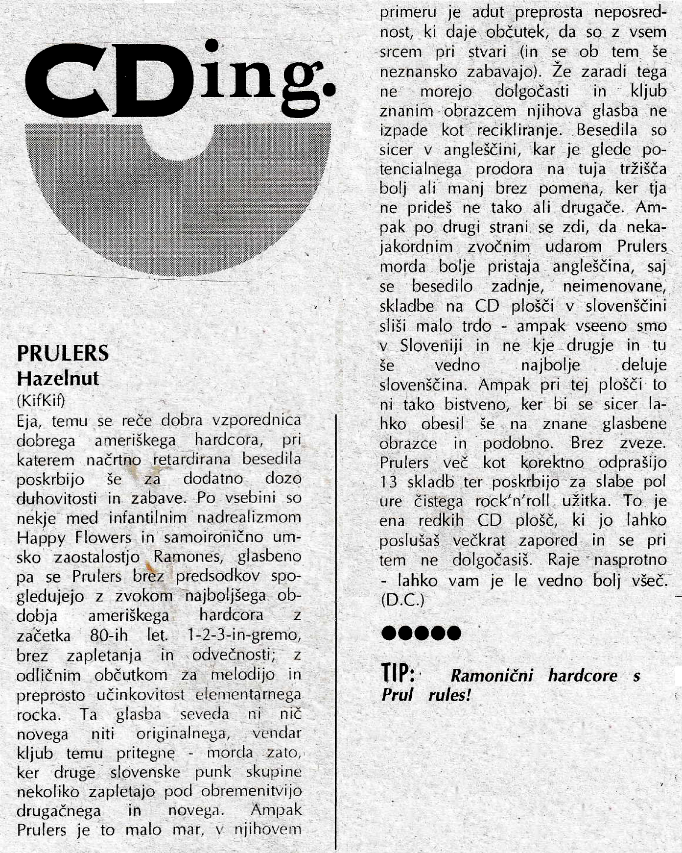 SI: Formiran leta 1988 je bil bend Prulers sprva trio - Sever (vokal / kitara), Urca (bas kitara) in Sexy (bobni) -, kmalu pa so takrat najstniki s Prul, enega specifičnih ljubljanskih kvartov, k sodelovanju povabili še Tozona na kitari. Po prvih vajah in koncertih po srednješolskih plesih se je Tozon odločil za drugo glasbeno pot, bendu pa se je pridružil Primula (kitara).Nastajati so se začele lastne skladbe in slediti so si začeli koncerti o vsej Sloveniji. Bend je izdaj svoj prvenec (in zaenkrat edinec) "Hazelnut" leta 1997 in s živimi nastopi prekrižaril državo. Leta 2016 je Primula zaključil sodelovanje v bendu, preostali člani pa nadaljujejo v originalni postavi. Občasno posnamejo kako novo skladbo, predvsem pa še naprej uživajo v živih nastopih, samostojno, pa tudi kot gostje (with Pankrti, Paraf, Šank Norris, Smacked, Curbrigen, Carina ... ).